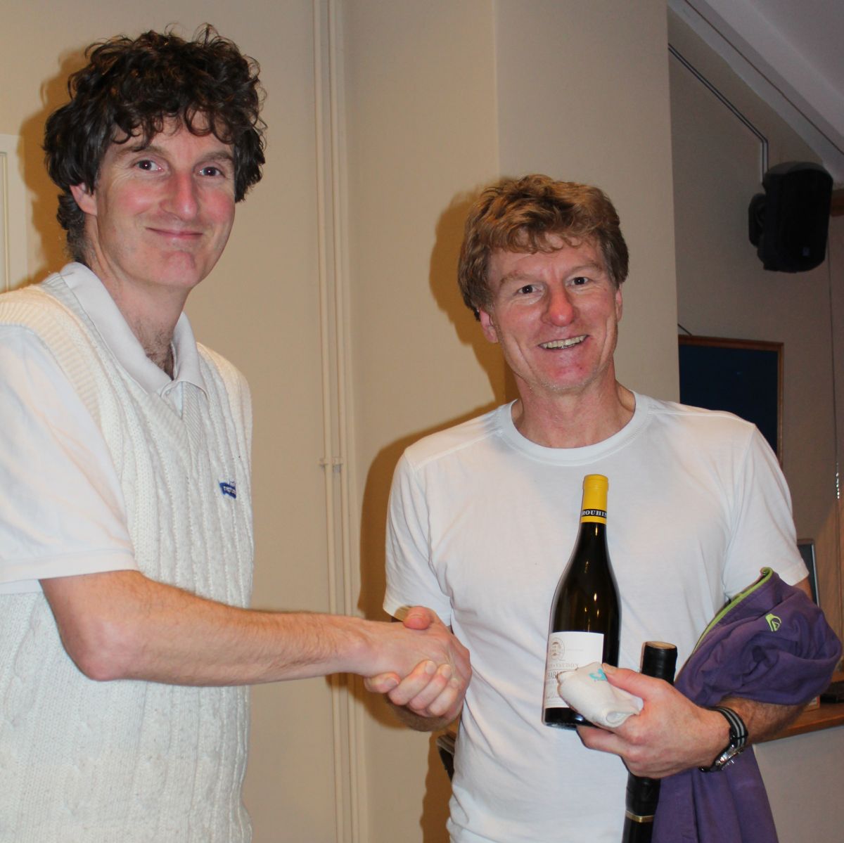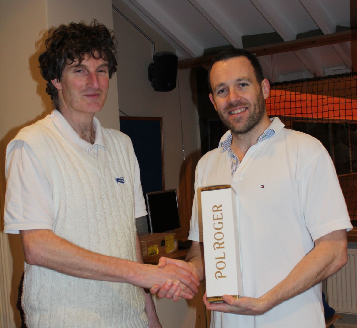The Finalists; Karen, Guy Kirk (scoring maximum points in the group stage), Robin Faux, Rich Wainwright, Hugh Markus and Richard Dunn (replacing Rupert Grose) were provided with much needed sustenance by Linda’s cakes and Rich’s biscuits. Robin (Grad Cup Champ) and Guy led after the singles, winning both their matches, but again it was the “complete player”, Rich Wainwright, producing excellent doubles performances too (ably partnered by Karen), who came though.