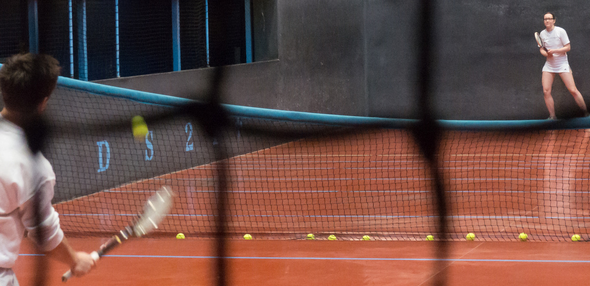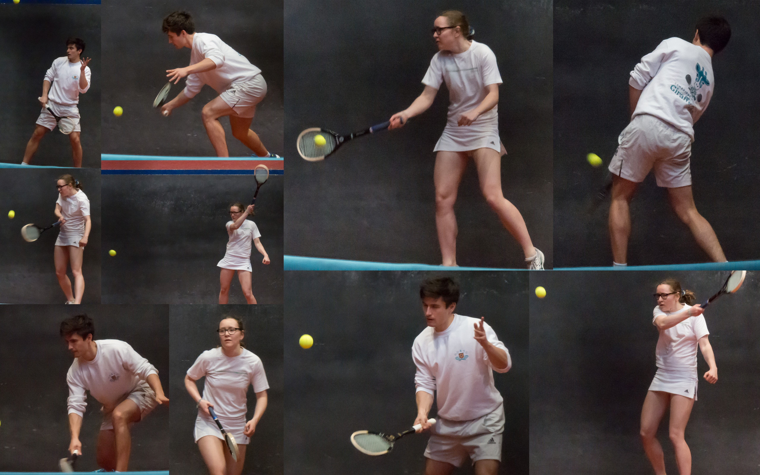 Olivia Chesser and Matt Shaw, this year’s Varsity Captains, set the tone for last night’s Challenge right from the first reste of a dozen or so (I lost count) hard hit shots. I almost felt sorry for Matt as he withstood a series of hard struck volleys from the Hazard end. Olivia rushed (there was nothing slow paced about the game) to a 4-1 lead mostly from that Hazard end, defying the conventional wisdom that in these sort of matches you really want to serve. Olivia finally did get the serve and incredibly Matt began to creep back. He was banned chases worse than 3 (which had to be explained to someone in the Dedans who really should have known to which of the two players this applied…). I couldn’t understand why Olivia wasn’t leaving anything but when she finally did, it fell better than 3 such was Matt’s accuracy. Grilles were traded but Matt clawed back to 4-all and inched ahead 6-5. But Olivia was totally unperturbed by a few unreturnable shots and serves and kept volleying anything she could. A few mistakes crept into Matt’s game as he hit the Tambour (and Hazard 2nd) at crucial points and just lost a short chase. The last reste was just like the first only with Olivia serving. Both players made some astonishing retrieves before Matt hit one that could be safely left….