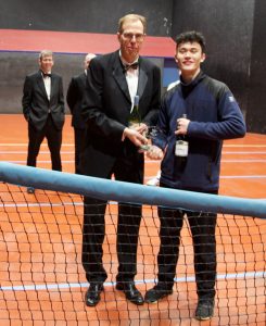 Kay was relaxed, and kept aiming at the winning gallery, but it let Giddins back into the game. He tried a couple of times to volley behind his back, but it didn’t work, and some loose shots by Kay meant Giddins could fight back, winning the next four games. In that time, there were some epically long rallies and fantastic gets off the tambour. Finally, with the score at 6-7, Kay pulled off the shot of the match, with a behind-the-back volley off the tambour. Giddins put a couple into the net, and Kay went for glory, but missed the winning gallery high twice. He finally took the match by placing the ball into the base of the tambour.