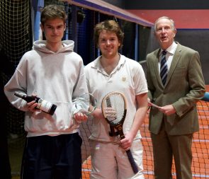 The morning group of Division 1 began with Vix Harvey and Andy Smith taking on Andrew Petrie and Jack Drew. Harvey was up at the galleries with some great volleying, but Drew was attempting to smack winners almost every shot, with Smith struggling to defend the back of the court, eventually running away with the match 6-3. Next on court was the student pair of Ed Hyde and Jimmy Campbell against Mark Perriton and Ivo Macdonald. Macdonald and Perriton showed a glimpse of what was to come. Both of them had lightning reflexes, Macdonald showing his rackets’ pedigree by standing up at the first gallery and vigorously defending anything that came his way. Perriton’s reach helped cover the back of the court, and they rolled over every other team in the group without losing a game. It was then a race for second place, after Hyde and Campbell overcame a large handicap difference against Harvey and Smith, it was all to play for in their final match against Drew and Petrie. However, Campbell was struggling to recover from a late night out, leaving Drew and Petrie to qualify without dropping a game.