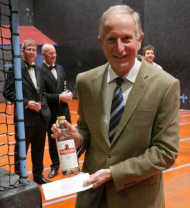 After the Club had calmed down, everybody settled in to nibble through the canapes and Nicholson Gin. That evening was the exhibition match between Ed Kay and Jamie Giddins. After the presentation of trophies to the cup winners, the match got underway, first to 8 games. Kay raced away with the first two games against Giddins’ demi-piques and railroads, but Giddins was able to take the third game to deuce, taking the game after a shot at the grille went high. However, Giddins served poorly, Kay opting to leave a hazard chase between his legs. Giddins responded well, cut-volleying the return-of-serve a couple of times to leave a short chase, but Kay careered a volley into the backhand corner to take the game.