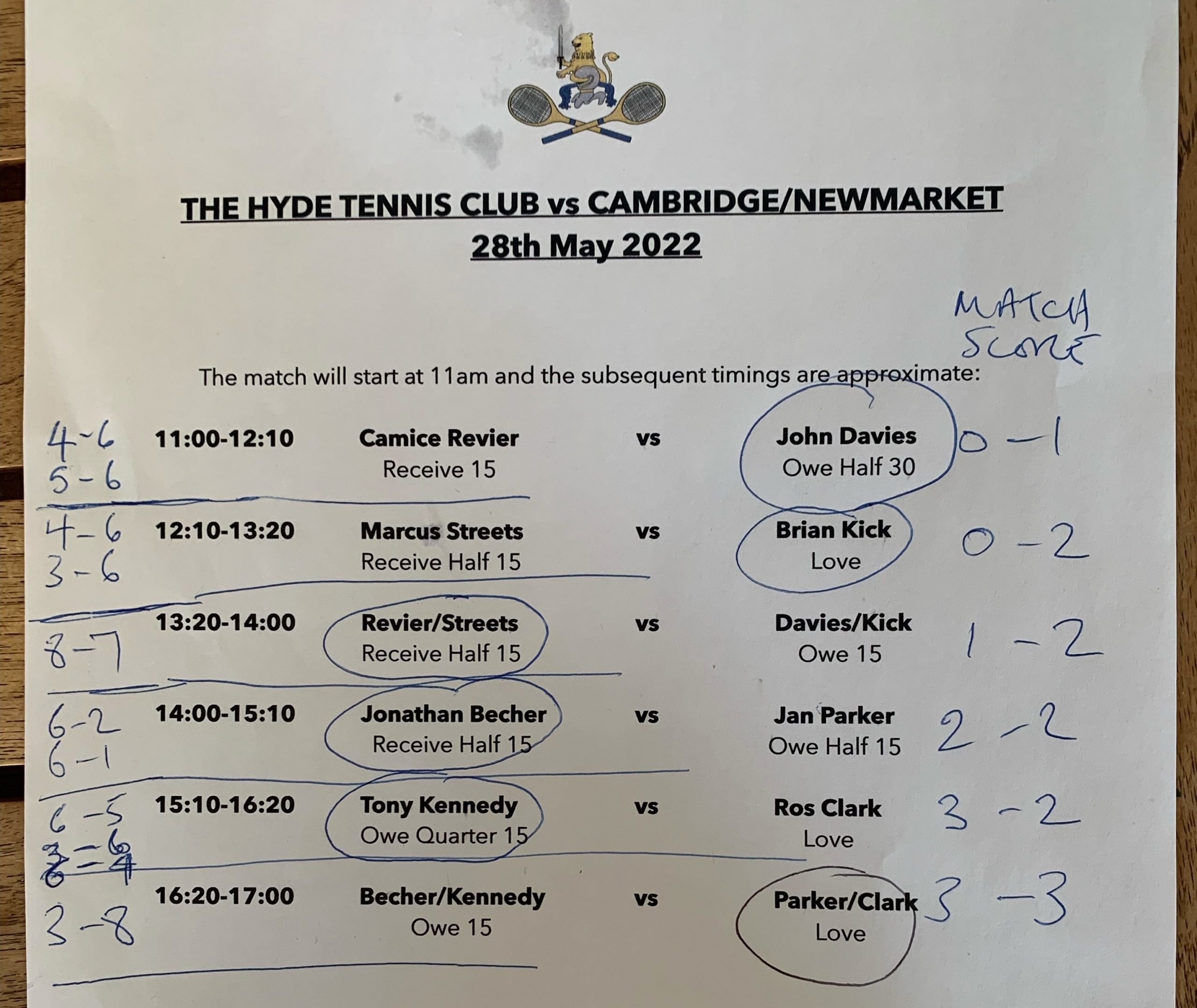 Well played everyone today, a great result, a 3-3 draw after some very close matches, especially the comeback of the day, Camice & Marcus recovering from being 0-5 down to win 8-7. All the games were very close, so once again the handicap system showed how well it works.