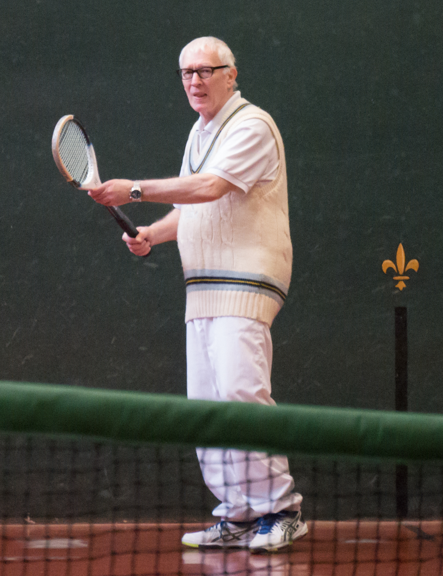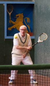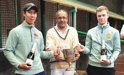 Back on the Green Court, LTCC match manager Paul Brennan, in spite of intermittent displays of competence and the thunderous imprecations that accompanied his various misfortunes and misjudgements, went down 8- 4 against an opponent, who, in his grey shorts, showed all the signs of having once been a very accomplished squash player. Next up in the Singles Adam Stokes, flummoxed by a quick surface and a back wall that is both considerably less susceptible to spin off the side wall and far more rewarding of cut than Leamington’s court, quickly succumbed, as did Roy Rogers who succeeded him, his difficulties compounded by a knee injury, he says, sustained early on. At this point the match stood at 4 – 2 to Cambridge.