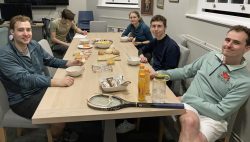 Cambridge finished the morning session slightly despondent but lunch was next and Pam T had cooked up a storm; the Cambridge men dedicated themselves to the task. Not a drop was left of either the chicken or the booze. Ian looked surprised to be playing again, and somewhat disappointed to move from his spot in front of the fire, surrounded by cheese, wine and bread and butter pudding; but with the terrific encouragement of David and his relentless good humour, he took to the court with an additional spring in his step: the pair ran away with an excellent set to 8 (very sensible post lunch match format).