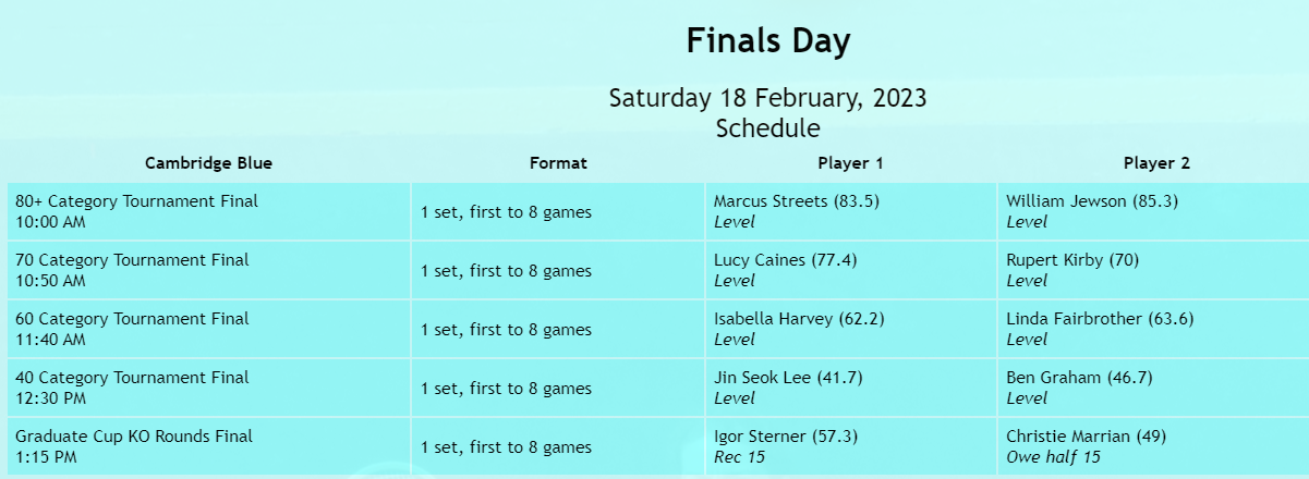 Tellingly the match was lost in the rubbers on the Green Court, where Cambridge won 5 -1. The other notable statistic is that a member of the extended Hollington clan was a participant in each of the ties which we were the victors. We look forward to welcoming the Cambridge Team up here next year and bamboozling them in return with our beloved court’s superior bounce and fizz.
