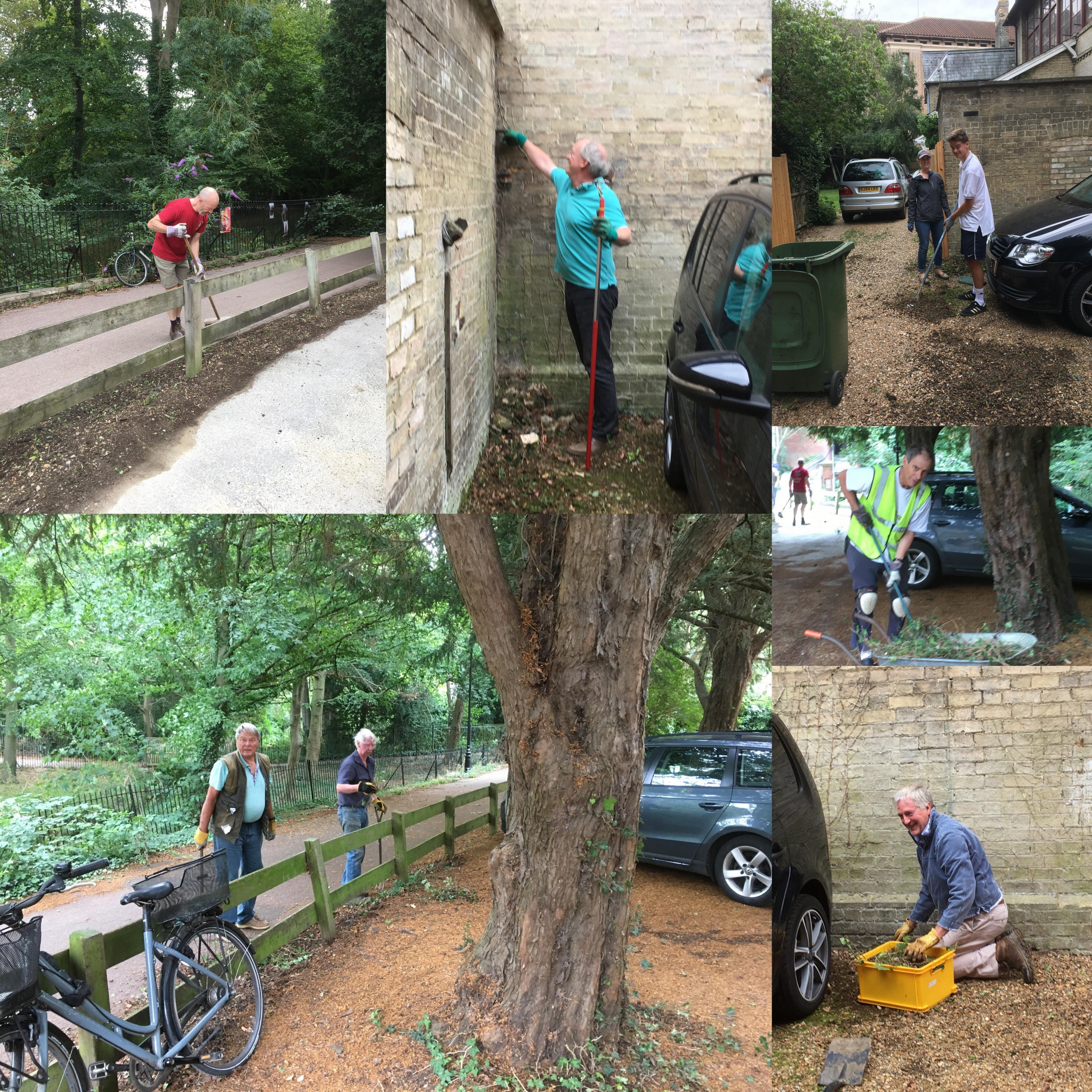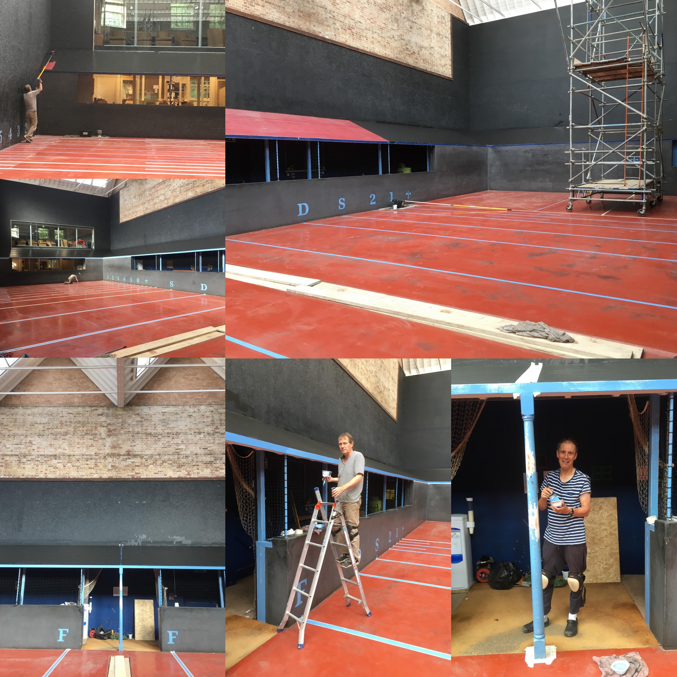 When you next go to the club be prepared for a bit of surprise. (Assuming that Grange Road has reopened following the visit of a monstrous crane today.) The Car Park has lost its Green and the Blue Court is no longer as Red. On Saturday there was no Time for Questions as the CURTC Gardeners arrived with an astonishing assortment of hi- (and lo-) tech hoes, rakes, spades and forks. Within an hour or so the Green bins were full and Mark Hobbs was trying (once again) to get me to hit the ball over the Green Court net at least twice… Meanwhile the Blue Court continued its transformation into a hessian-free, brightly-painted and not-so-Red Court at the Home of Real Tennis. Everything is on track and the Court should be back to doing what it does best on Monday evening.