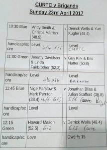 A fun afternoon of tennis ended with CURTC and The Brigands even at 2 apiece with the final Doubles being definitely the MOTD. CURTC’s Perriton/Parslow combo fought back from losing the 1st set to the Blisss/Stafford Brigands by winning the second 6-5. Keeping the service end they won the first two games of the (shortened) 3rd before crucially giving up a chase (service is sooooo important in Doubles….). Back came the Brigands to even things up at 5-all but CURTC had serve and whatsmore it was Mark’s left handed monster serves being fired down to the Hazard end. But arghhh… a Double fault and a chase and the Brigands took control and with it the game, set and match. A great spectacle and it did mean we could get started on Jeremy’s (Davidson) excellent lunch…