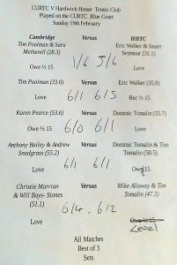 February is mostly dedicated to the Category tournaments and practice for a series of matches against the other place at the end of the month. However, a visit from Hardwick House proved a timely reminder that our favourite sport provides a most enjoyable way of spending an afternoon in good company with some excellent food, wine and dare I say it Tennis! The scorecard doesn’t reflect the closeness of the contest let alone the enjoyability of the contest. Not surprisingly, we already have half a team for the return visit next year to one of RT’s iconic venues!