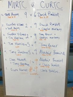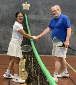 They came from far (St Andrews) and wide (Jesmond) for CURTC’s Mixed Doubles tournament. The 13 pairs were divided in the two Divisions each with semi finals and a final. While last year both divisions were dominated by visiting players, this time the locals struck back. In Group A, it seemed clear that the CURTC President had used home court advantage wisely in her choice of partner as they made some tough matches look relatively easy. Group B was also dominated by a local pair, Sonja & Jon but the runners-up spot came down to the last group game where any of the other three pairs could have qualified. Kenneth & Luisa had travelled the furthest and got the serve back at 5-all and 40-all against Guy & Kate. However, the visitors were denied by a cruel bounce off the Hazard penthouse which looped just out of bounds.