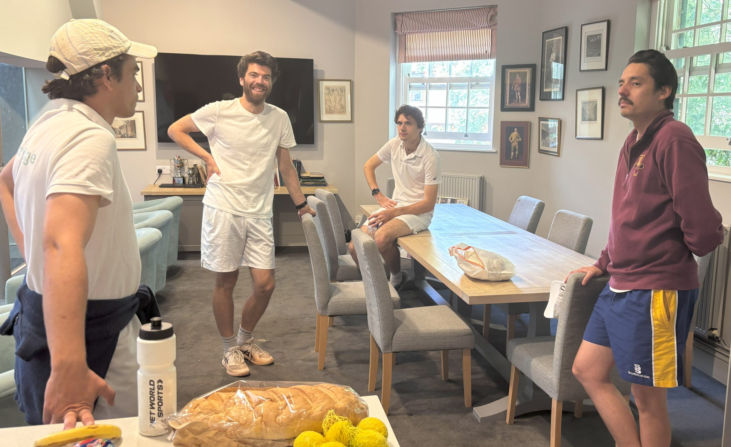 It was hot… Even at 8:30 when we arrived at Newmarket to take on the hosts in the first round of the East Anglia Cup. The EAC is a round robin between the four East Anglia Clubs, each match comprising two Singles and a Doubles with Charles Norbury & Miles Hember doing the Singles and myself and President Vix doing the Doubles. Newmarket is a tough court to play on as it is a bit bigger and just a bit different form CURTC. Having assured everyone to be prepared for a low bounce, the balls proceeded to bounce around in an almost Blue Court fashion.