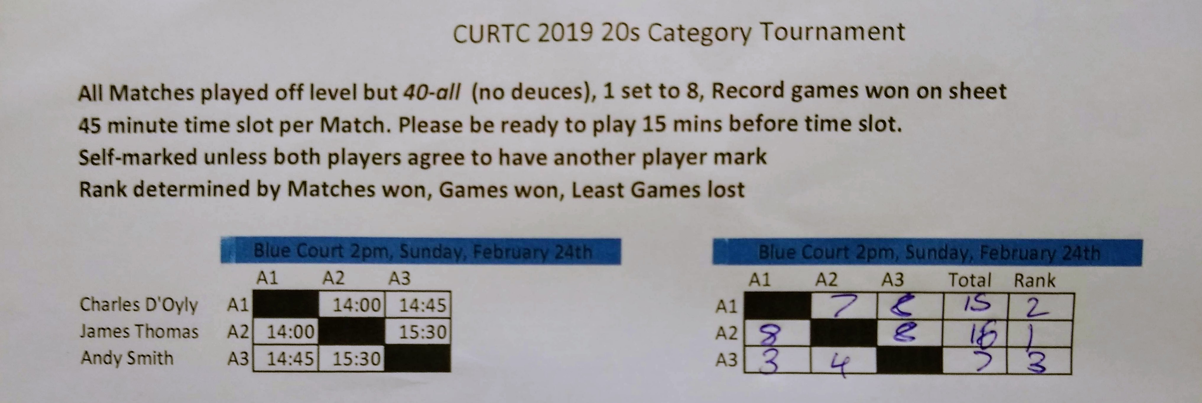 The Finals Day (Saturday, March 16th, sponsored by Hannay Robertson Financial Planning) roster is now complete and will include Michael Firth & Ben Geytenbeek (50s), Andy Smith & Mark Perriton (30s) and Jim Ludekens & Vix Harvey (40s) along with the previously announced winners. The CURTC Ladies Championship is at the Semi-Final stage and it looks as if Vix is may be rather busy on the 16th….