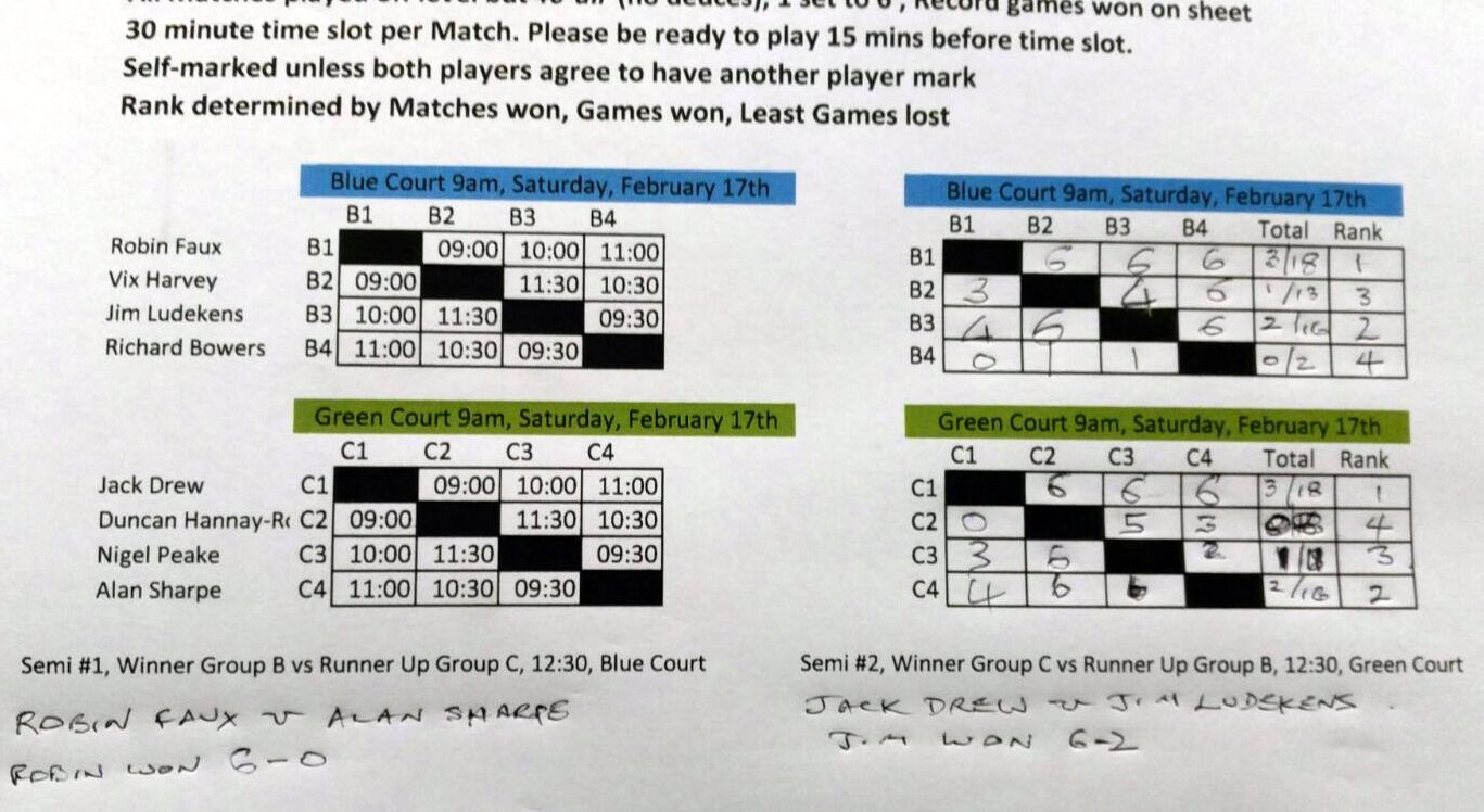 Congratulations to Robin Faux and Jim Ludekens who will face each other in the 50’s category Final at 10:20am (tbc) on Finals Day, sponsored by Hannay Roberston Financial Planning, Saturday March 17th. They played a tight match on Saturday but this could be even closer in the Final!