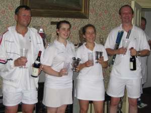 We squeaked through undefeated in the Friday evening round robin stage, which included a rubber against two members of the Hird Dynasty (mother and the "other place" triplet). Congratulations to Doris and Sarah who went on to win the plate tournament.