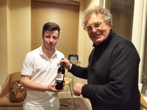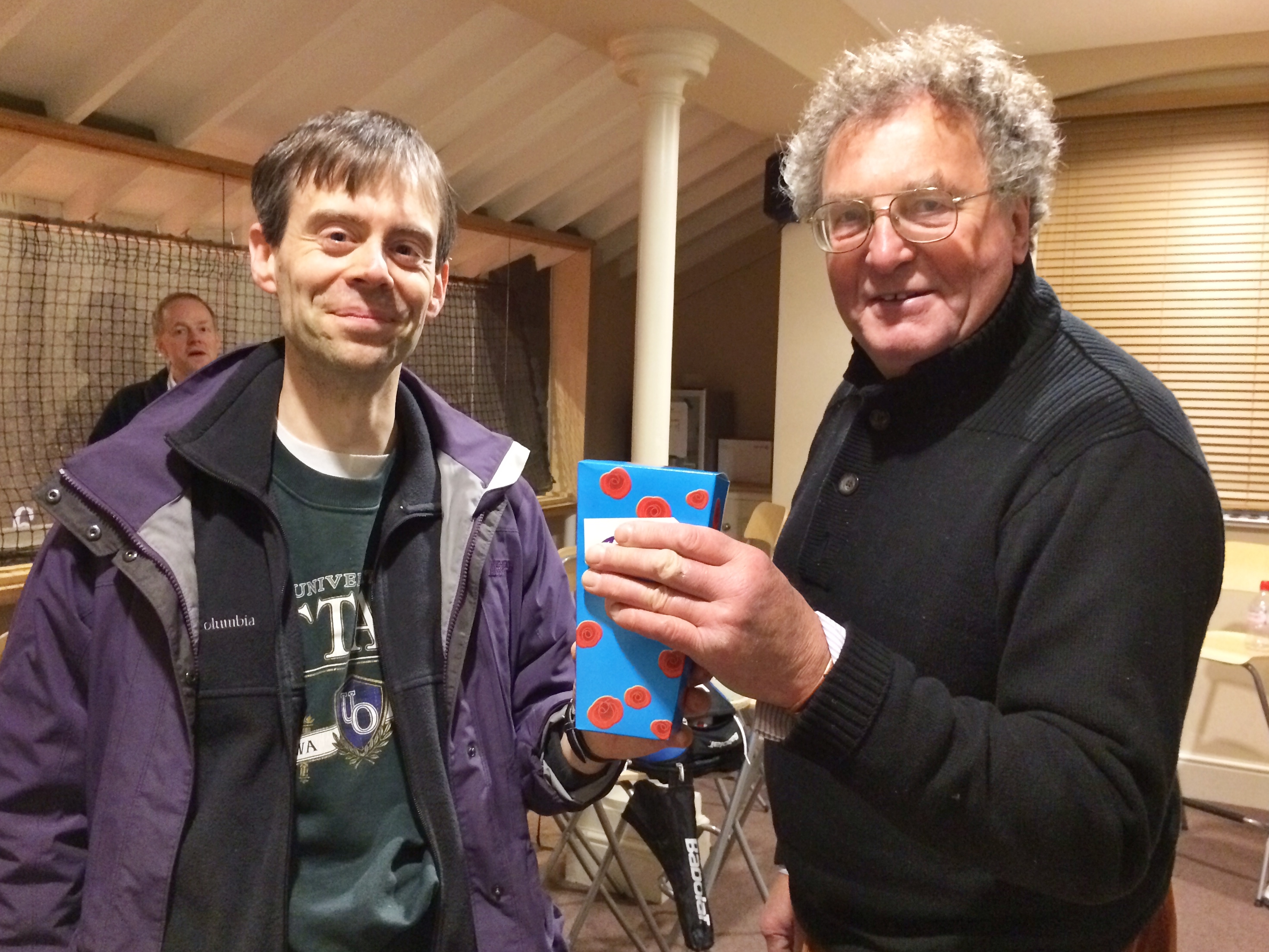 After a total of 18 hours of play across both courts involving 24 singles and 12 doubles matches we had 8 group winners who returned at 6pm to contest the knock-out stages. In the first of these Geoffrey Greatrex defeated Karen Pearce 6-4. Then the young pretender Ed Hyde defeated James Thomas (a former Xmas winner) 6-2, Smuts Beyers despatched last year’s winner Gillian Moore by the same score (6-2), and Hugh Markus chalked up a 6-0 victory over Richard Doe.
