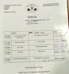 Update: the weather was a winner on Sunday, as Holyport (with one exception) had to cancel their trip and Prested was forced to forfeit two matches. Cambridge did win 2-1 in the matches played with yours truly partnering Will Boys-Stones and Andy Smith registering in the win column and Captain Kirk gamely giving something for Prested to cheer about. Next up, a Home tie for the Pol Roger squad and a trip to Wellington or Radley for the Brodie team. Both matches on Sunday, January 28th.