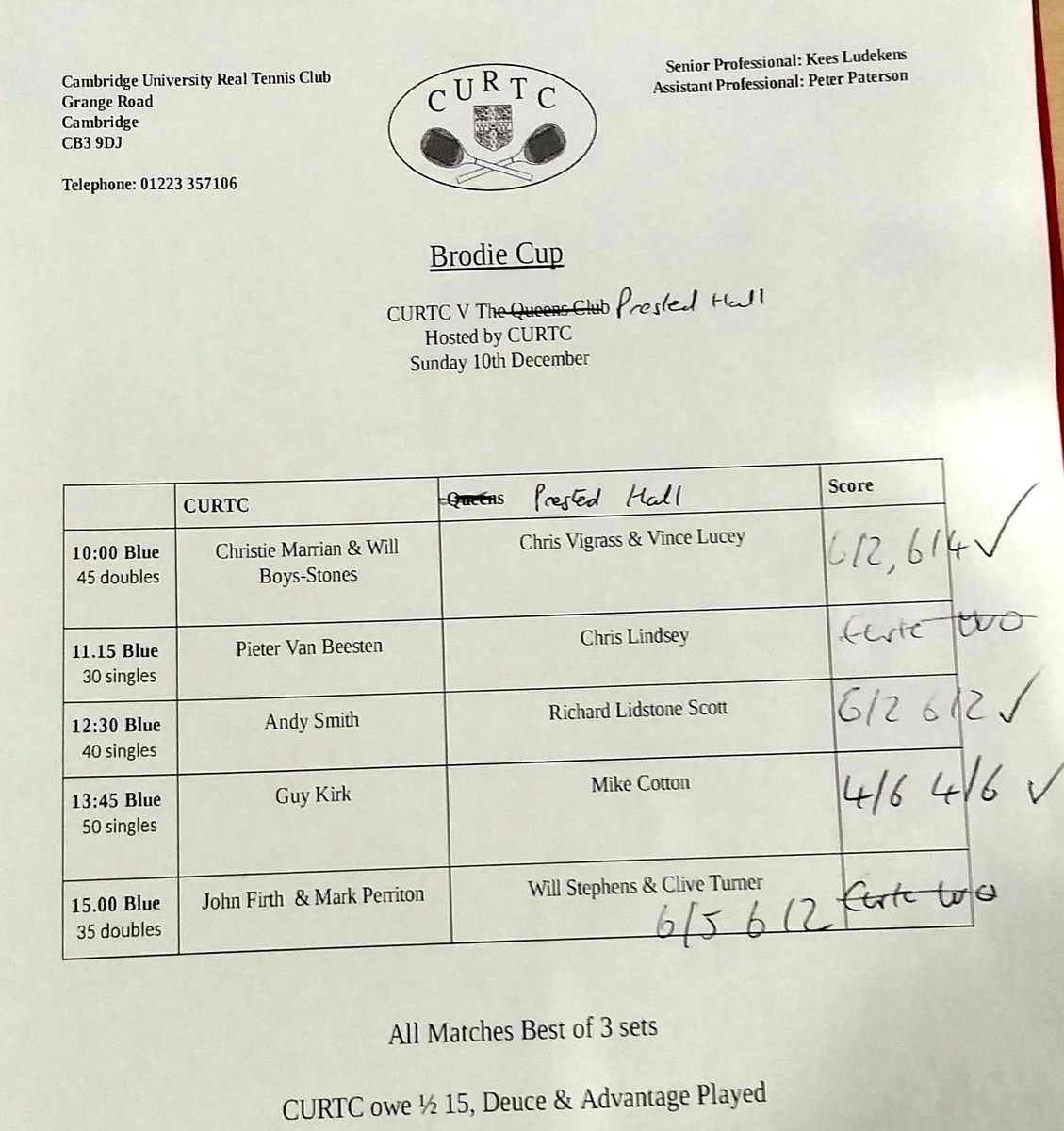 Updated Update. Wrote too soon on the Brodie result. The two missing rubbers will be played this weekend….