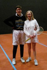 In the final, there was nothing between the players. Robert served sidewall serves to great effect, with Ginny needing to volley the return of service, which she did with accuracy into the corners. Ginny served underarm twists to which Robert replied with forces at the dedans and at the mainwall. There were many excellent rests made more fascinating by the contrasting styles of the finalists. At 3-all Robert was able to steady his game, overcome his unforced errors and take the final three games and the Championship (6-3)…. The day ended with the Senior Professional taking the photo of the finalists above.