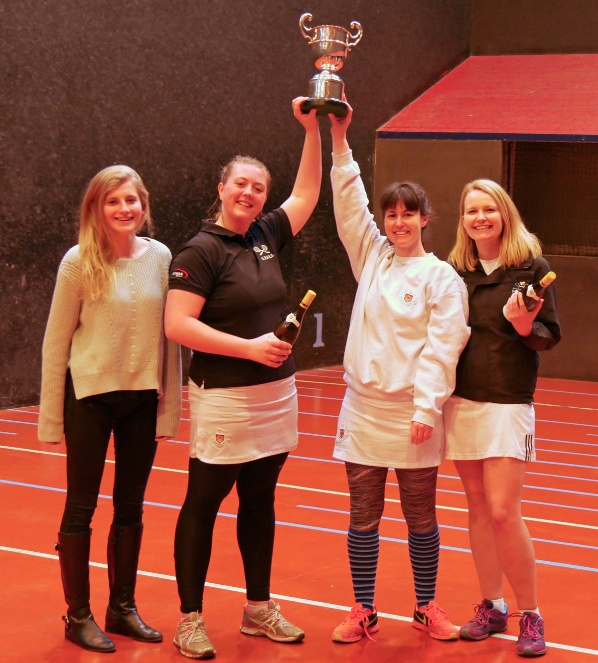 … the Giraffe Tournament Finalists! Preceding the Final, an entertaining series of Group matches, where the after effects of the previous evening were much in evidence, included the first ‘chaseless’ set of the Tournament. The names of the chaseless are being withheld by request. To the left, Runners-up Andy Smith (L) and Robin Faux (R) receive their loot from Organizer in Chief, Vix Harvey. They were beaten 8-7 in a pulsating Final by the Varsity Ladies Team pairing of Annie Plews (C/L) and Amanda Murphy (C/R) seen below with Lucy Barrett (L) and Emily Chadwick (R).