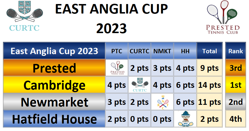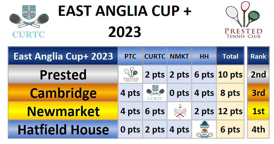 Sunday saw our nearest neighbours, Newmarket, led by the unbeaten and still youthful Richard Dunn, take the honours. Prested (led by the undefeated Jane Taylor) and Cambridge were unable to recreate last year’s almost dead heat ending 2nd and 3rd. TK was again on court, wearing his Singles hat, and provided the much appreciated solid and liquid sustenance for one and all.