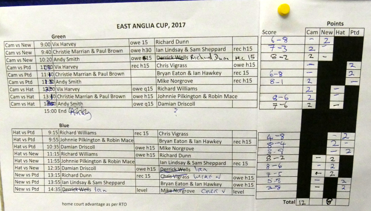 First up was Vix against Richard Dunn of Newmarket and a crucial game it turned out to be. Vix dug herself out of a hole at 4-1 to get back to 6-all before Richard edged it 8-6. Vix had another tough loss against the experienced Grandpa Vigrass but came storming back against Hatfield’s Richard Williams. Andy Smith was in fine form winning his three matches and the Doubles combo of yours truly defeated the Hatfield and Newmarket pairs, the latter match being interrupted by a visit from the fire brigade following a direct hit on the alarm from an errant forehand. But alas we came unstuck against the Rose Bowl winning pairing of Prested’s Ian Hawkey & Bryan Eaton. In fact, we did a reverse Vix by letting a 4-2 lead slip before getting back to 6-all and then losing the last two games. This proved to be the difference in the tally which saw Prested retaining the EAC with the final Score being: Prested 14, Cambridge 12, Hatfield 8 & Newmarket 2. Congratulations to Prested! We look forward to next year when we are off the Hatfield.