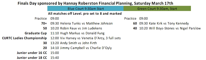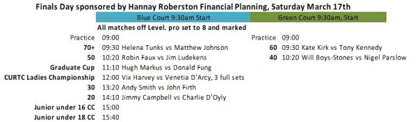 Yes, CURTC’s Finals Day, sponsored by Hannay Robertson Financial Planning takes place tomorrow starting at 9:30am. There will be 10 finals including two Junior Club Championships, six Category tournament Finals, the CURTC Ladies Championship and Graduate Cup Final.
