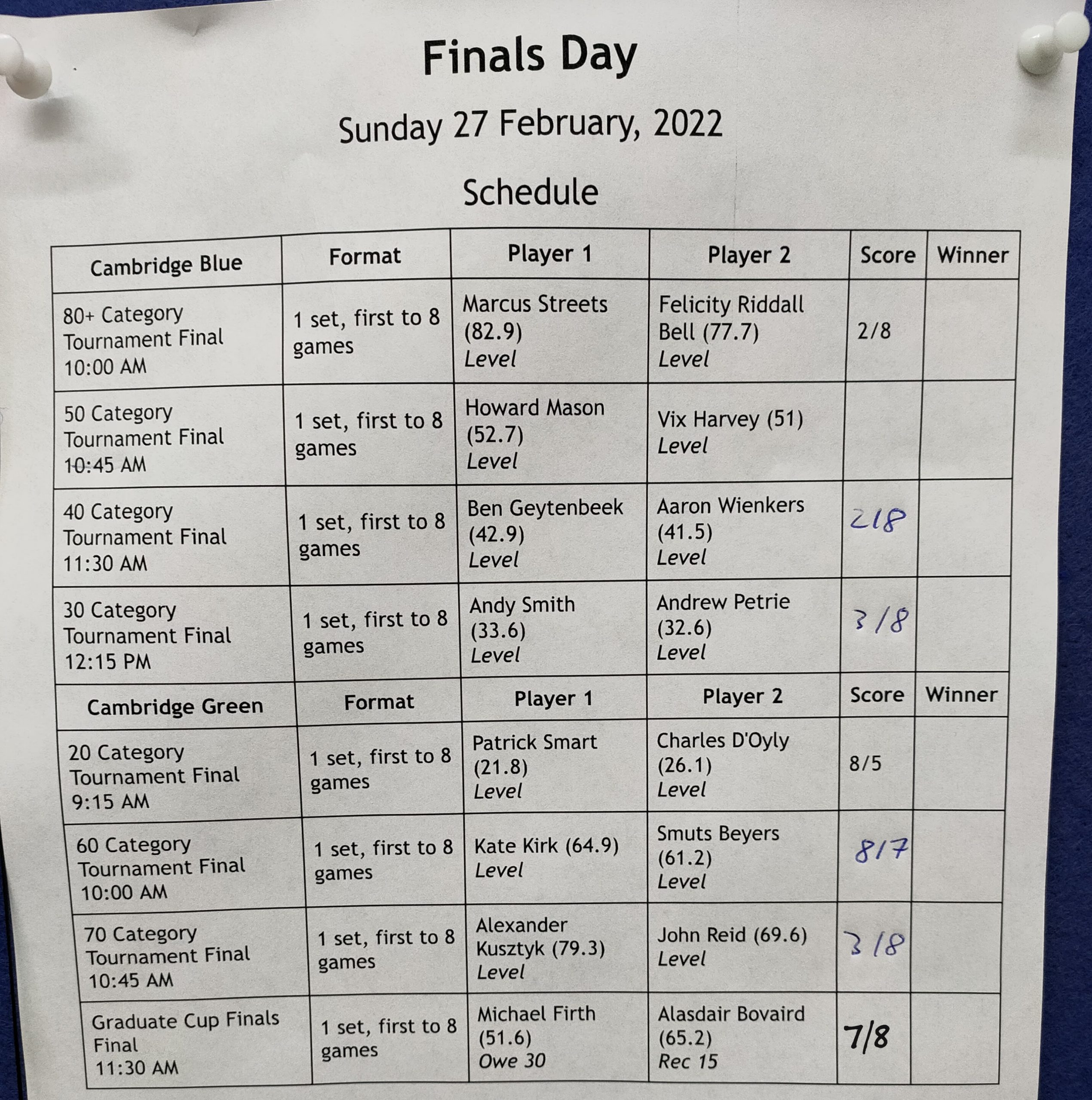 The first results are in. Congratulations are due to Patrick, Andrew, Aaron, Kate, John and Felicity who will find their names on the Category Tournament Honours Board once we work out where to put them! A gripping Graduate Cup Final went to Alasdair Bovaird who just pipped Michael Firth 8/7 in a hard hitting encounter.  Click on the image and you will be able to read the results! More to come…