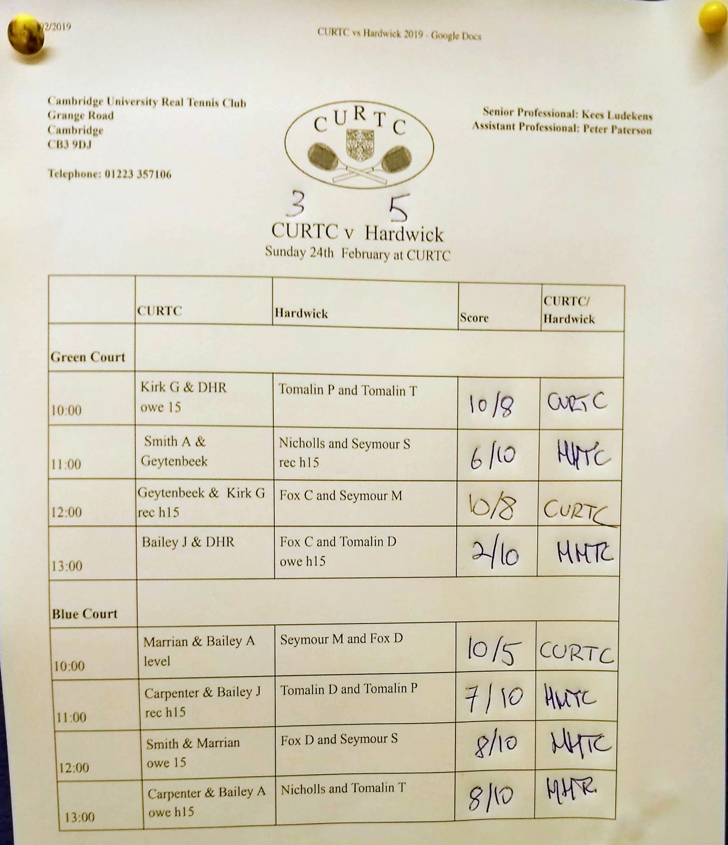 …but chef Guy Kirk pulls one back for the team in the Club Room Kitchen. On an almost as sunny (but a bit warmer) day as our visit to Hardwick last year, our visitors were sufficiently generous to not take full advantage of some CURTC on-court lapses as we recovered from 3-0 down in the first match and all but blew 7-1 and 5-3 leads in the other two matches CURTC won. There was some excellent tennis (admittedly mixed with some of the usual dross) and mighty smiting from which my hand (left, oddly enough) is still recovering.