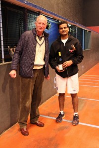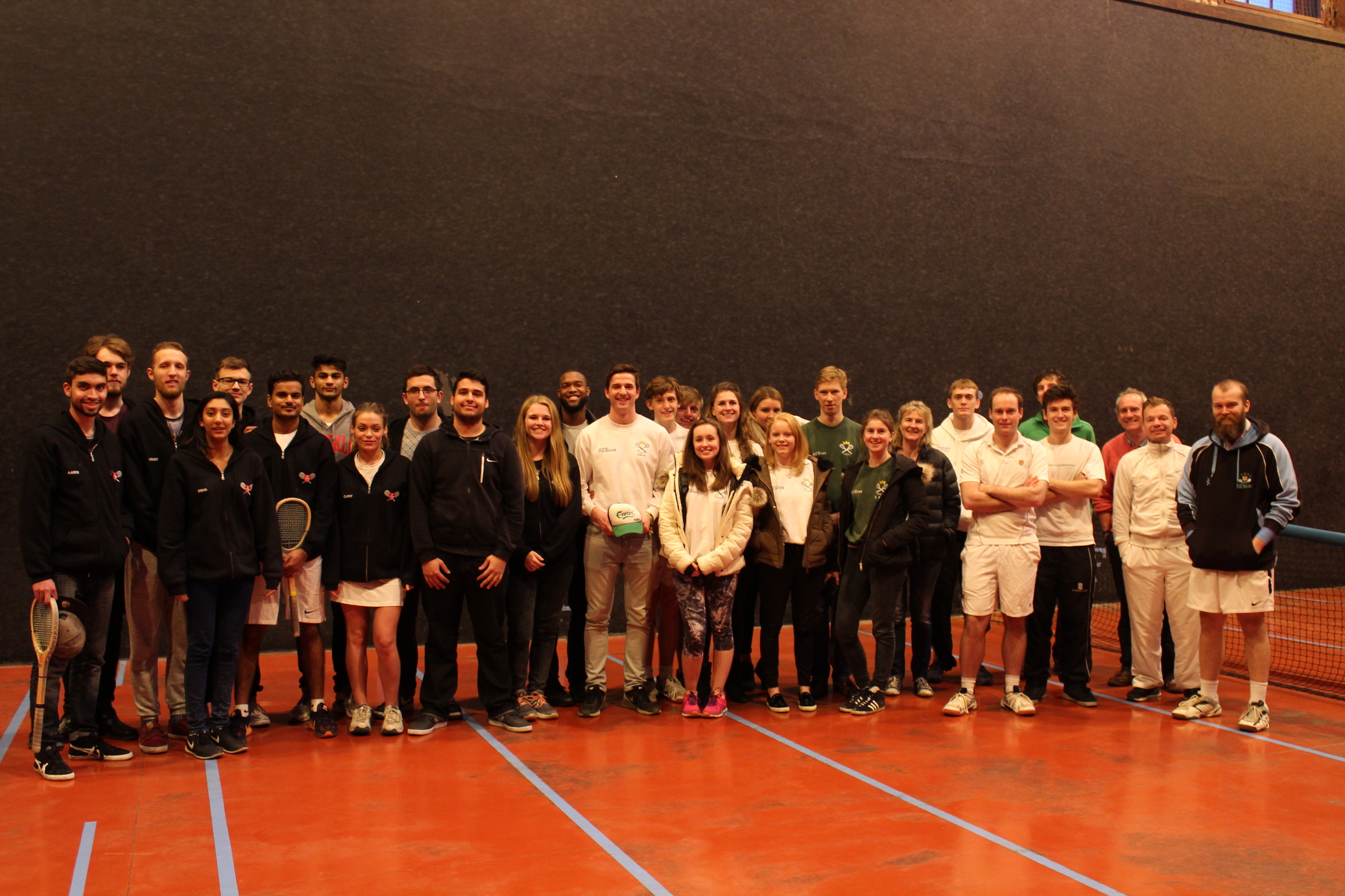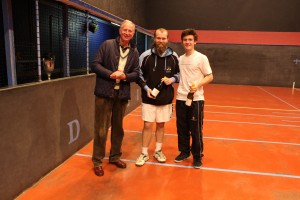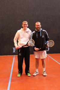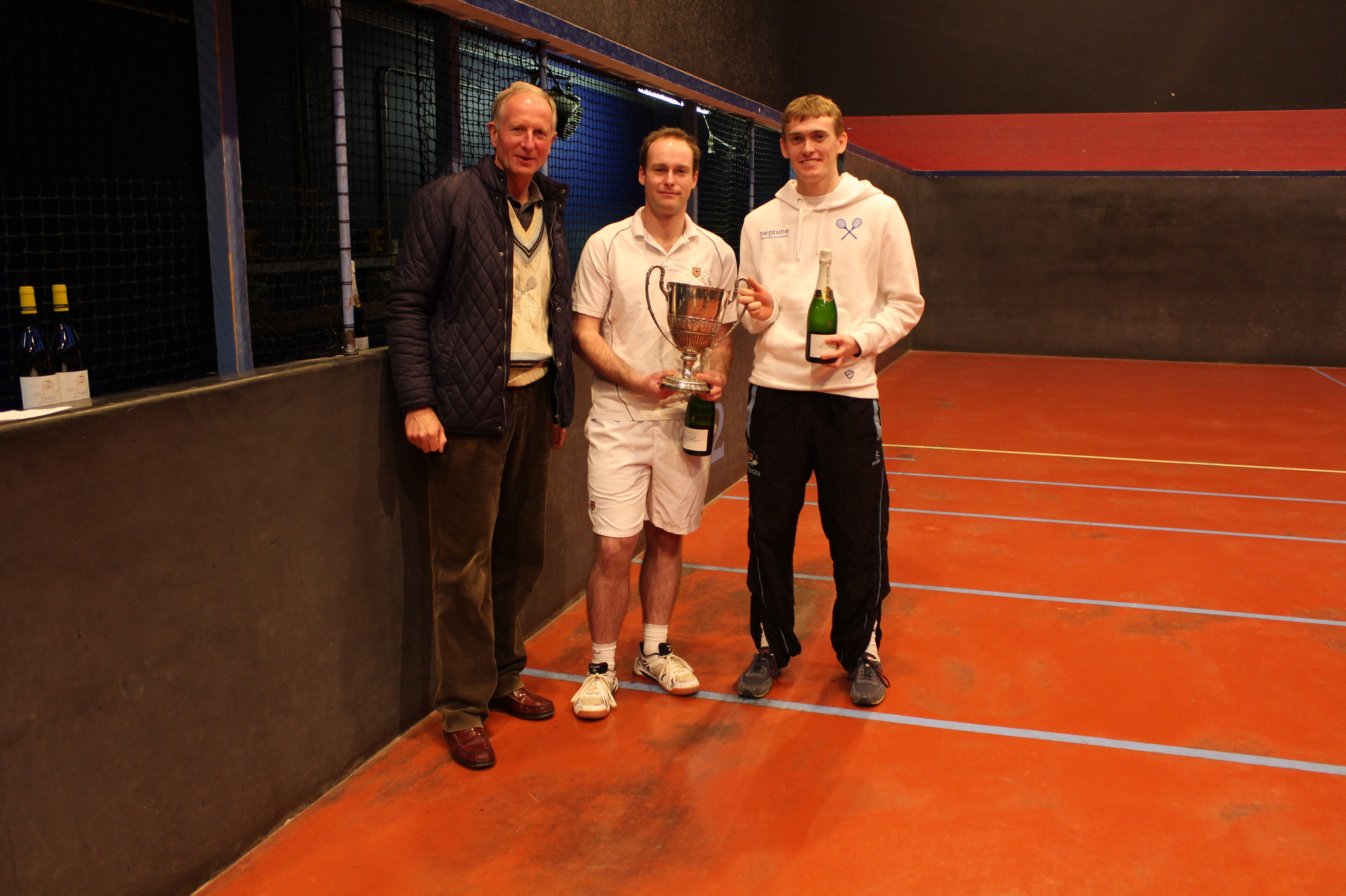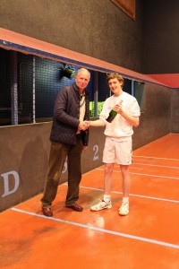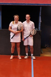 The final got under way with a clash of the men’s and women’s captains Alex ‘jet lag’ Evans (13.7) and Sophie ‘Osprey of the year’ Morrill (46.1) and was continued with Ed ‘thanks for coming’ Kay (4.1) vs Jimmy C, both ties going as expected to CURTC 1. Playing for pride, Matt Shaw returned from playing Fives to partner Jimmy in the doubles. Despite Jimmy’s cunning plan to put the opposition off with looping lob dedans forces, the 1st team pair were triumphant.