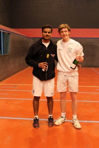 In the first semi-final of the Inter-uni cup Cambridge 2 played Exeter in what was probably the best contest of this tournament. Home heroes Matt ‘tonsils’ Shaw (25.7) and Jimmy ‘5.18am’ Campbell (27.2) faced Ben Boddington (13.7) and Tom Larminie (54.6). The two singles matches went with handicap and left the rubber to be decided by the doubles. After trading games for the first half of the match, Matt Shaw found some good serves (after much urging by his partner) and clinical volleys to compliment the increasingly solid back court play of Campbell. Cambridge completing the win to set up a repeat of last year’s all Cambridge final against CURTC 1 (Ed Kay, Jamie ‘who?’ Giddins and Alex Evans) who had already cruised through their previous rounds to reach the final themselves.
