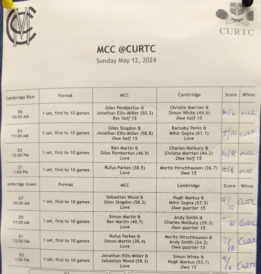 Sunday was Cambridge and a 10am start which stretched the coffee making resources and biscuit supply somewhat. In order to avoid the plethora of 7-all’s of the previous day, all matches were a single set to 10 of which only 2 went to to 9-all which kept the schedule more or less on track. Cambridge took the honours (5-3) including all 4 matches on Fortress Green. So no countback was needed to decide on the engraving although the absence of any trophy (lost or found) made this somewhat academic.