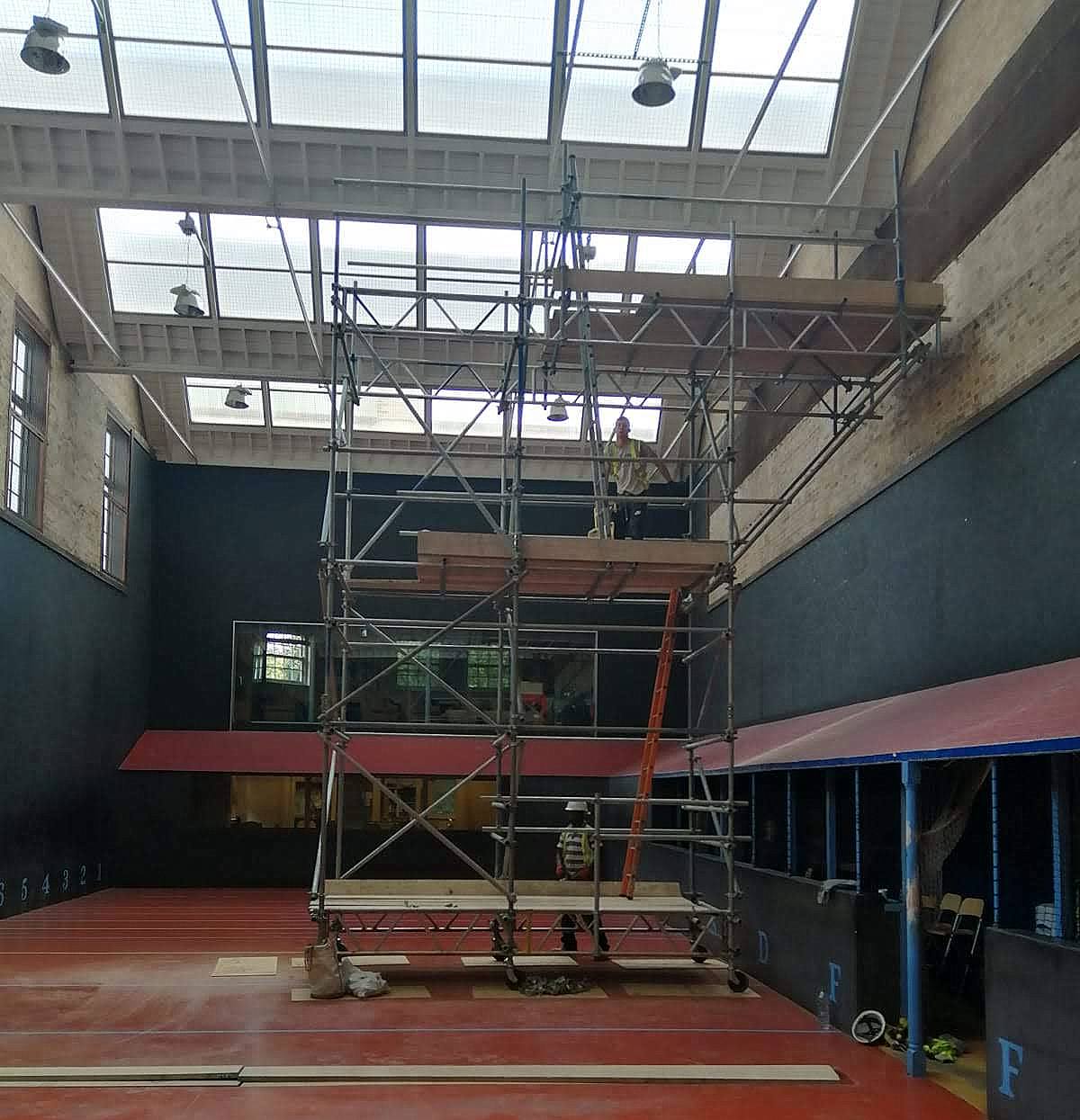 This monster has been spotted prowling up and down the Blue Court. The Gallery wall is being cleaned up and the remaining hessian removed by our valiant (and brave) tower crew of Simon & Kees. Then the painters will get started…
