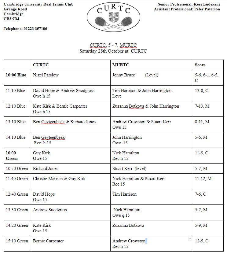 …for an Inter Club match on Saturday. Chris Bray dropped by to say hello, wish his team well and compare Tennis Hips (Tips?, Ed; No, Hips, Author; OK if you say so, Ed). After 11 hours (to the minute) of tennis, comprising of 4 Doubles and 8 Singles, MURTC edged the contest 7-5. Nigel Parslow got CURTC off on the right foot by overcoming the powerful boasting of Jonny Bruce in 3 sets. Done well as Jonny was doing, the Boast can be very effective if the depth is right. There also the added ‘twist’ in that I at least can never work out which way it is going to break after the umpteenth bounce of walls an floor.