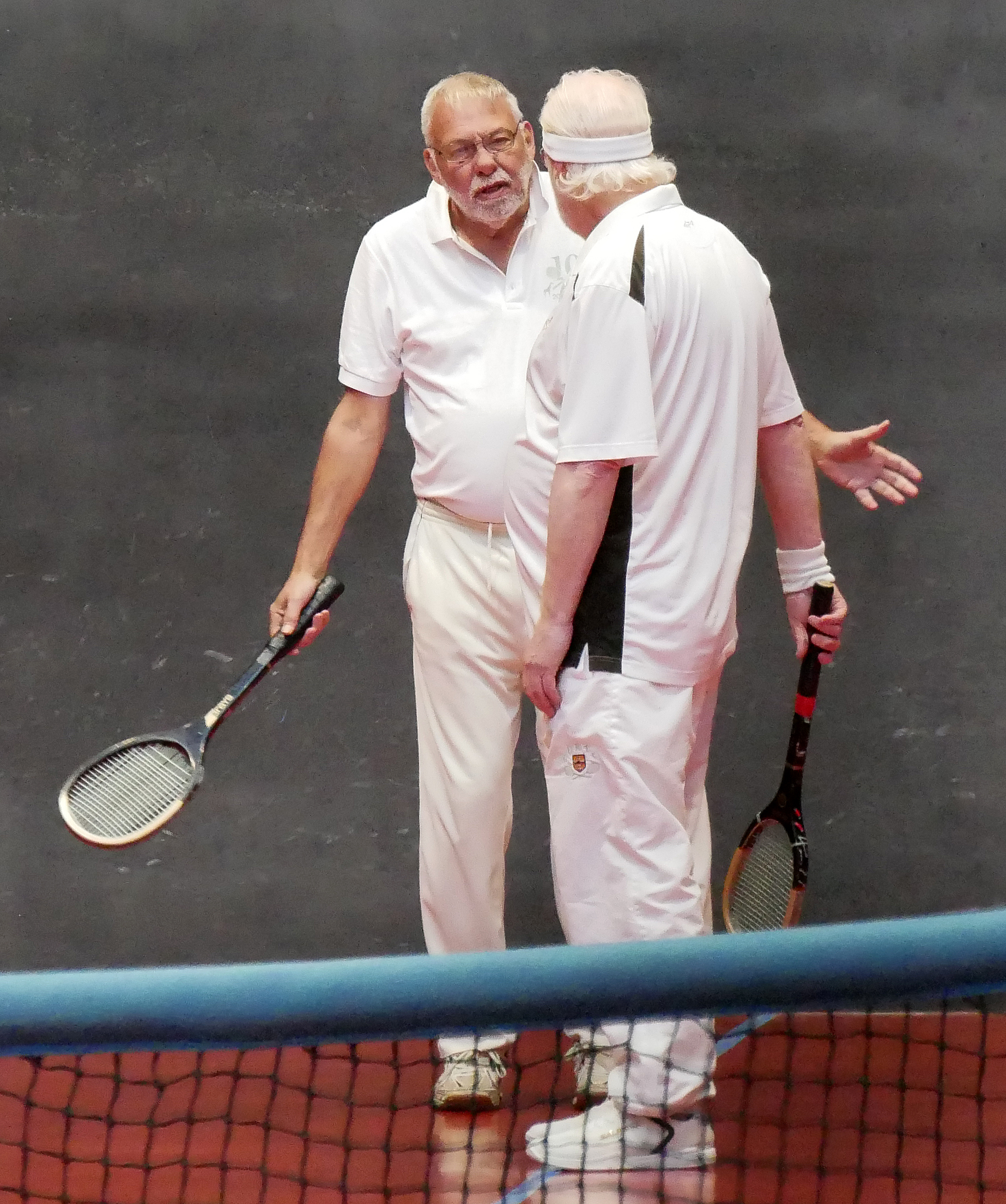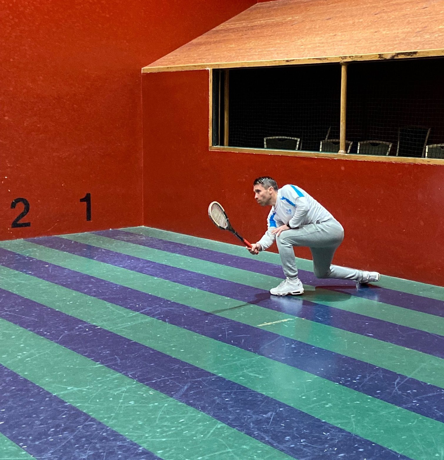 Back on the Green Court, LTCC match manager Paul Brennan, in spite of intermittent displays of competence and the thunderous imprecations that accompanied his various misfortunes and misjudgements, went down 8- 4 against an opponent, who, in his grey shorts, showed all the signs of having once been a very accomplished squash player. Next up in the Singles Adam Stokes, flummoxed by a quick surface and a back wall that is both considerably less susceptible to spin off the side wall and far more rewarding of cut than Leamington’s court, quickly succumbed, as did Roy Rogers who succeeded him, his difficulties compounded by a knee injury, he says, sustained early on. At this point the match stood at 4 – 2 to Cambridge.