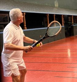 Saturday Morning Bruce Henning had to face two Simons, both comparatively new to the game, and improving quickly.  Simon Benney found a devilish serve, that Bruce, as a southpaw on a foreign court, struggled to deal with.  Simon Kirk on the other hand had the opposite problem, falling victim to Bruce’s spinney railroad. He did however overcome it, and both Simons progressed to the next round.
