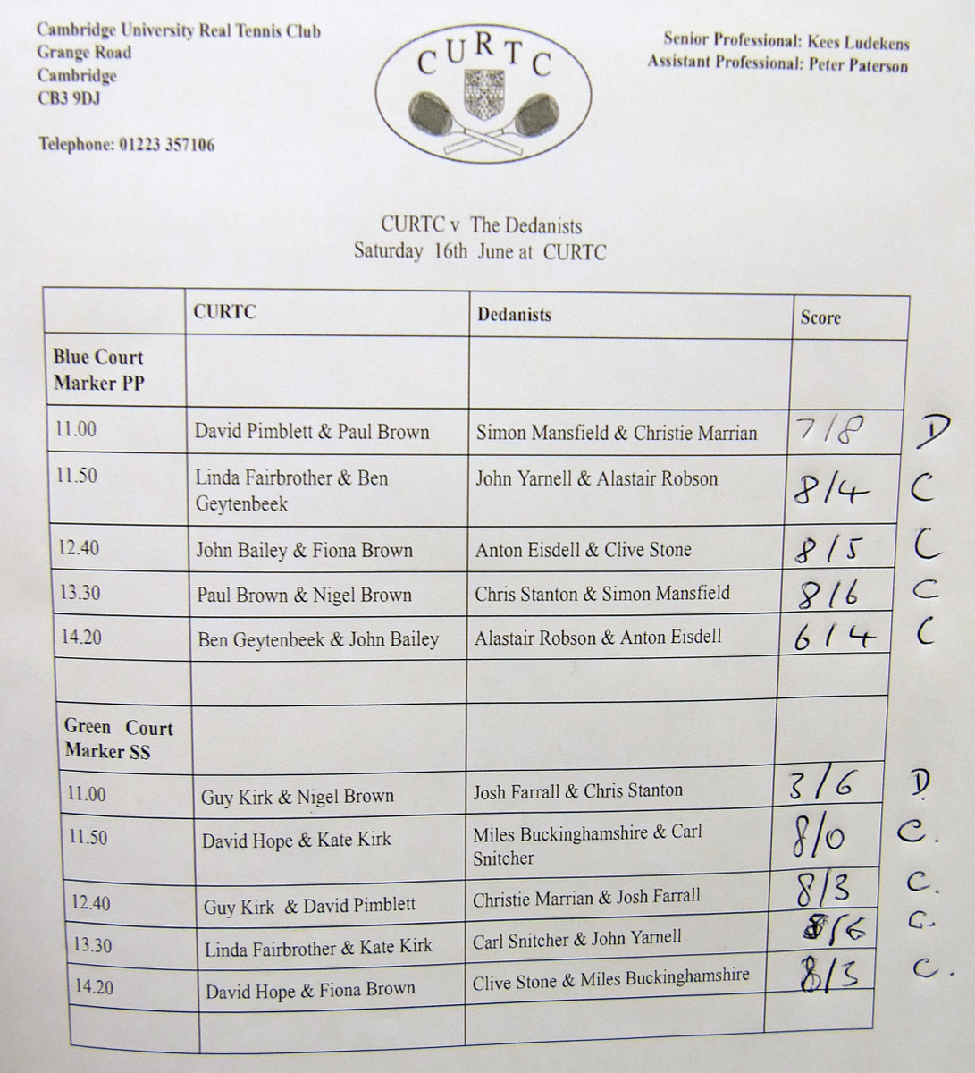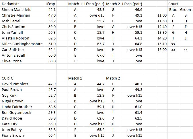 Through a masterstroke of programming the pairs in each of the 10 matches were within 2 handicap points of level, so off level we played (with full deuces). On Court the brightness continued for the Dedanists continued as we/they romped to victory in the 1st two matches. Well, romped is perhaps a bit misleading as on the Blue Court, myself and Simon Mansfield produces an almost Lazarus worthy comeback from 4-2 down to win 8-7. On the other Court, Josh Farrall and Chris Stanton took an entirely different approach. They got their noses in front before starting a seemingly endless series of deuces. The marker finally took pity on the players (and the spectators) by calling the game 6-3 to the Dedanists after the 50 minutes allocated time… We had long finished our 15 games by this point.