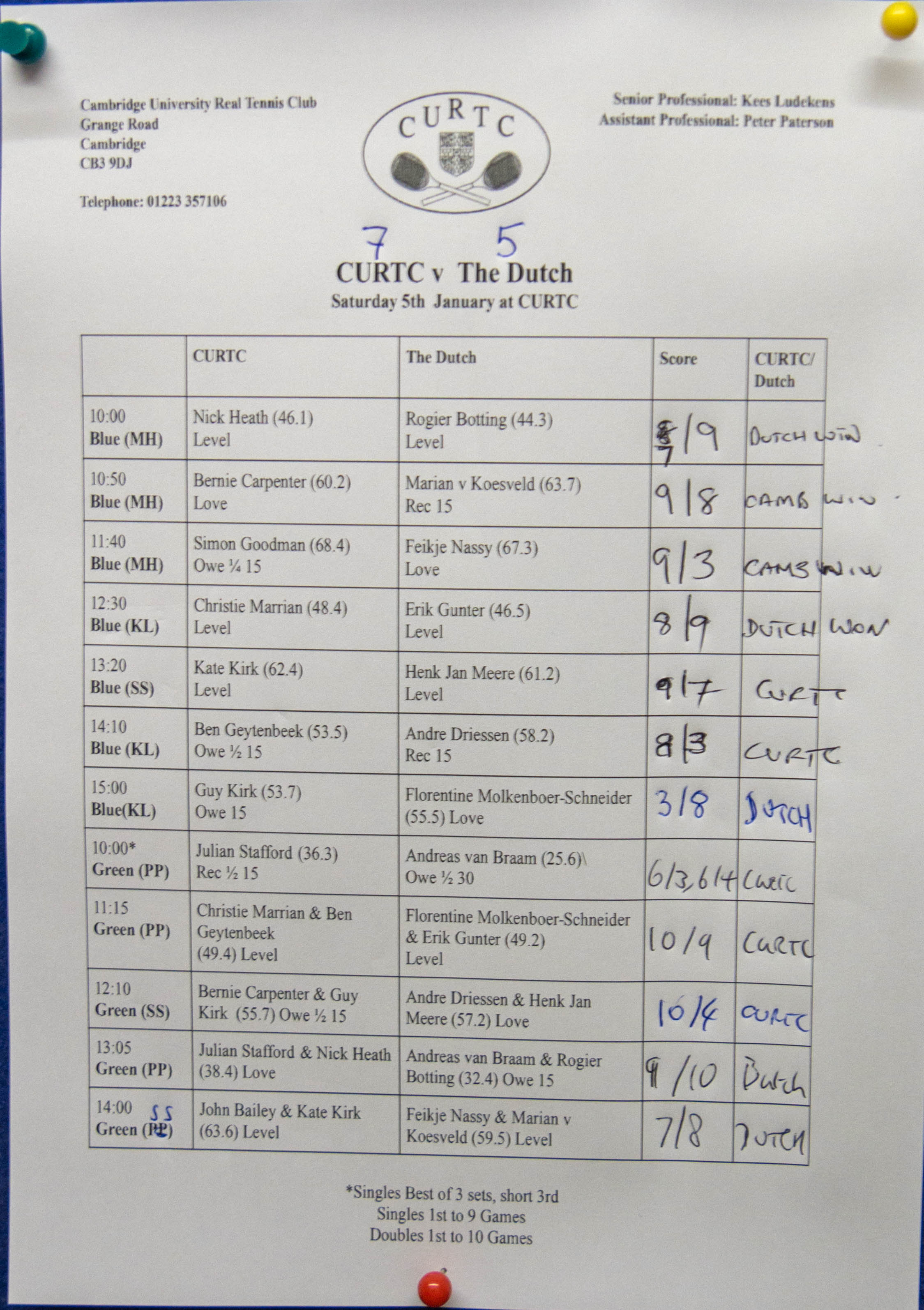 5 of the 12 matches went the full distance and 2 more were only one game short of the maximum. So the handicap system seems in good shape but the schedule did suffer! At the end of it all, CURTC had managed to reverse the orange tide which had engulfed us over the past two years. But it did take a considerable number of games to do so, I reckon the entire match comprised of very nearly 90% of the maximum possible number of games!