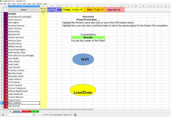 You will receive an e-mail* telling which of the three ‘Packs’**, headed by Rudolph, Donner & Blitzen, you are in. Please play frequently and often against members of your and other Packs (Singles or Doubles). Santa’s IT elf assures us the scoring system is so simple Santa himself could use it. The set-up is in the Blue Court Dedans. All you need to do is highlight your name and click on ‘WIN’ or ‘Lose/Draw’ as appropriate. No need to enter the actual score. This is all for fun and the IT elves have promised us the beta version of the software just as soon as they have finished some deliveries in a couple of weeks. (We told them to use Amazon’s new drones but they insist that Santa is somehow better ‘suited’)
