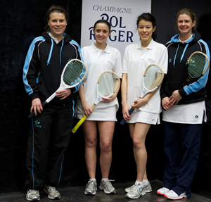 The Ladies’ team had a big handicap disadvantage, but both Emily Brady (captain) and Imogen Whittam took their matches to 3 sets. Newcomer Karen Pearce, playing only her fifth competitive match, lost in straight sets, but shows a lot of promise for next year. Emma Samia-Aly, the 2012 captain, won in straight sets against the 2012 Oxford captain, Maggie Henderson-Tew. The two ladies’ doubles matches on Saturday morning both went to Oxford in straight sets, but as is often the case, the score didn’t reflect the closeness of the matches, with a lot of games going to several deuces and the final outcome hinging on just a few points here and there.