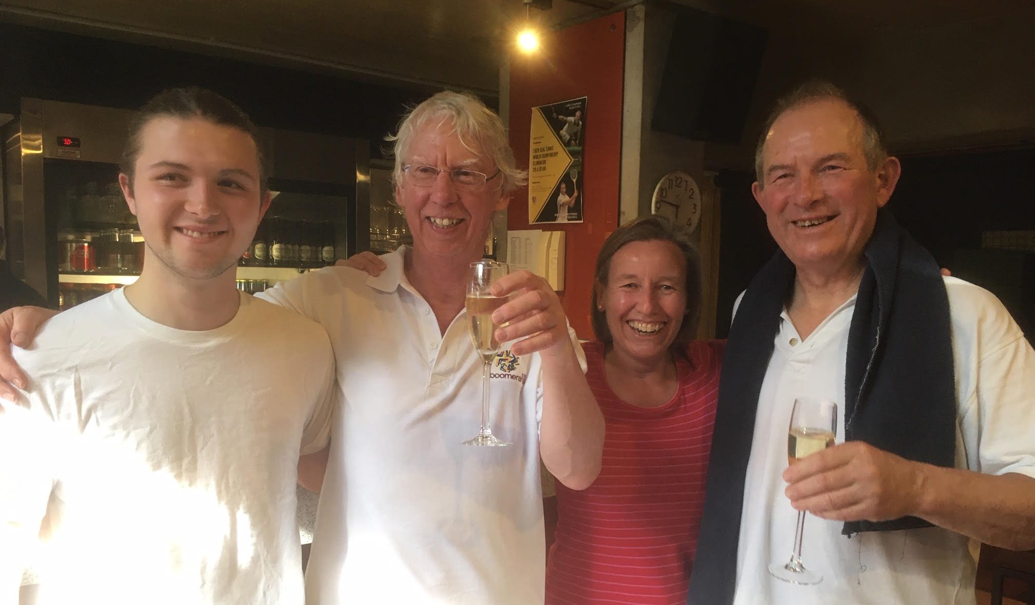 This biennial team handicap doubles tournament takes place in Melbourne in January and 33 teams participated from around the world. The “Wood is Good” team consisting of CURTC members Julian Stafford and Derrick Wells along with Derrick’s son Charlie and Katie Leppard from Oxford was not feeling optimistic when we started the tournament as we had all 4 of our group matches owing handicap including several rubbers which were one serve ban tambour. Our stalwart team laboured through only dropping one set during the group stage. Our secret advantage was Charlie Wells having recently only played with a hangover under the auspices of Ben Taylor-Matthews at Leamington and Rob Fahey at Prested Hall. Charlie now staying with the team at our splendid Yarra Valley billet played in fine form and attracted bandit status – one of several improving players – but crucially very consistently.